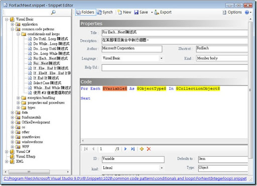 下載完,解開壓縮檔,可以看到應用程式(SnippetEditor.exe)以及應用程式設定檔(SnippetEditor.exe.config),當你執行SnippetEditor.exe,程式會預設載入你VS2008中所有的Code Snippet。在此亞當斯先點選For Each...Next 陳述式(位置:C:\Program Files\Microsoft Visual Studio 9.0\VB\Snippets\1028\common code patterns\conditionals and loops),以下是執行結果。右邊的視窗中,會顯示所選取的Snippet的所有屬性資料以及程式碼,還有參考的組件、加入的Namespace等等。