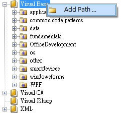 首先,在左邊的選單視窗中,選取Visual Basic,按下右鍵,選擇Add Path,將路徑是設定到想存放Snippet的資料夾,這邊為:C:\Sample\MySnippet。