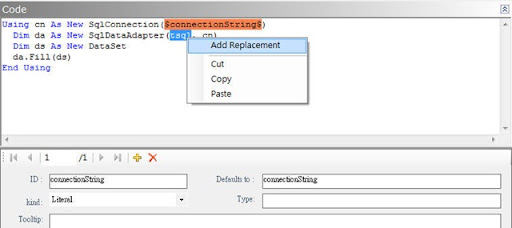 把這個Snippet的屬性和相關程式碼加上,並設定SQL語法必須是可以變動的。程式碼以及屬性設定如下圖:對於程式碼亞當斯要把其中的連線字串以及SQL語法設定為可以被取代的兩個變數,設計方式就是針對你要被置換的變數按下右鍵,選取"Add Replacement",Code Snippet Editor就會自動幫你將那個變數設定完成,Type設定為String。如下圖: