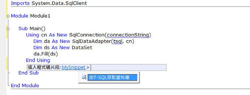 接下來,亞當斯打開NB上的Visual Studio 2008,新增一個測試專案,在程式碼頁面按下"?"+Tab,就可以使用自己所自訂的片段程式碼了,選取MyMySnippet->由T-SQL存取資料庫,命名空間System.Data.SqlClient還會幫你自動加入唷。